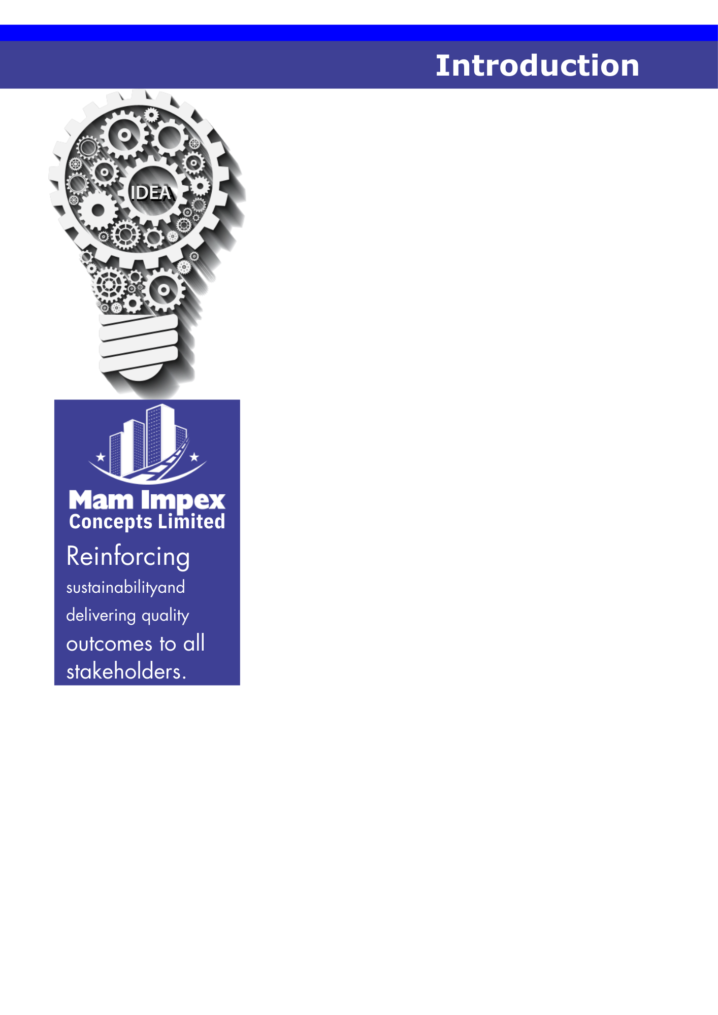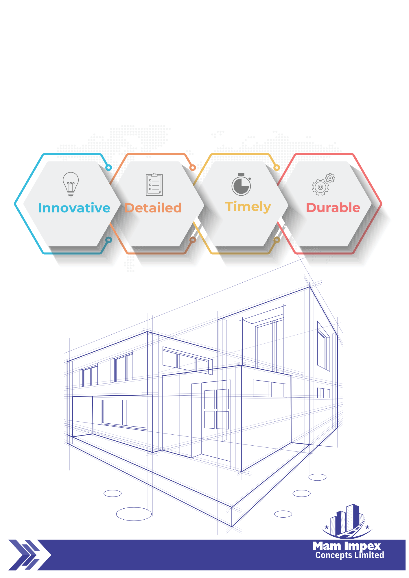 We, at Mam Impex aim to be the pillar of success and are unparalleled when it comes to the Construction business. We are professionally acclaimed in our chosen eld. We are known not only for meeting, but also, exceeding customer satisfaction and expectations. Our goal is to succeed, enabling our diverse team of valued employees to hold great accountability towards our prized customers. Mam Impex aims high, with integrity, diversi cation, consistency, high standards, principles, and outstanding customer service. We are determined to be number ONE.